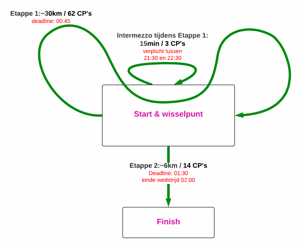 Omdat elke race weer anders is, hebben we een race schema opgesteld en gedeeld. Dat zie je ook vaak bij Adventure races, en is erg fijn voor de visueel ingestelden onder ons. Zo is duidelijk dat etappe 1 begint voor het intermezzo en doorloopt tot en met er na. Dus je moet, en kan, de punten verdelen. En daarna volgt etappe 2, die niet eindigt bij de start maar elders. Etappe 1, het startpunt er van, en het intermezzo zijn wel op 1 locatie. Dat alles wordt weergegeven met een overzichtelijk diagrammetje.