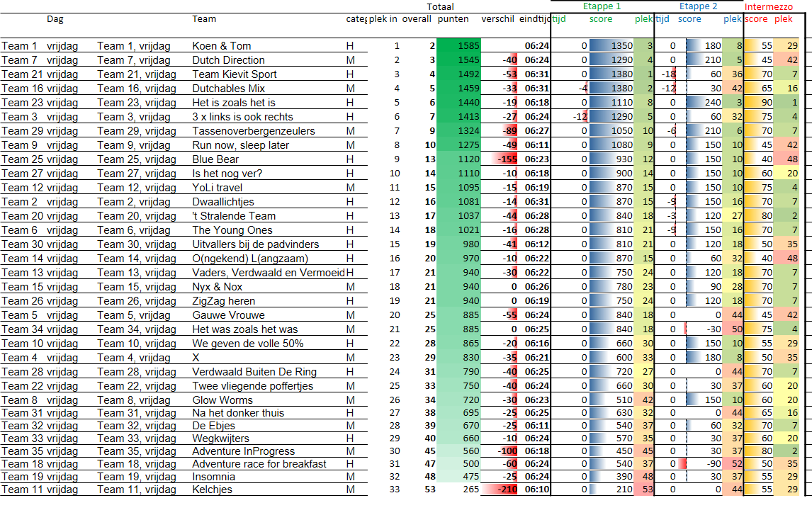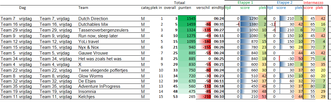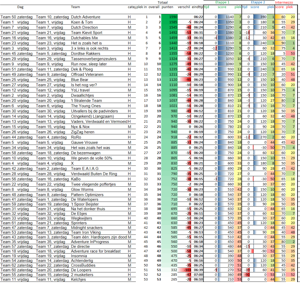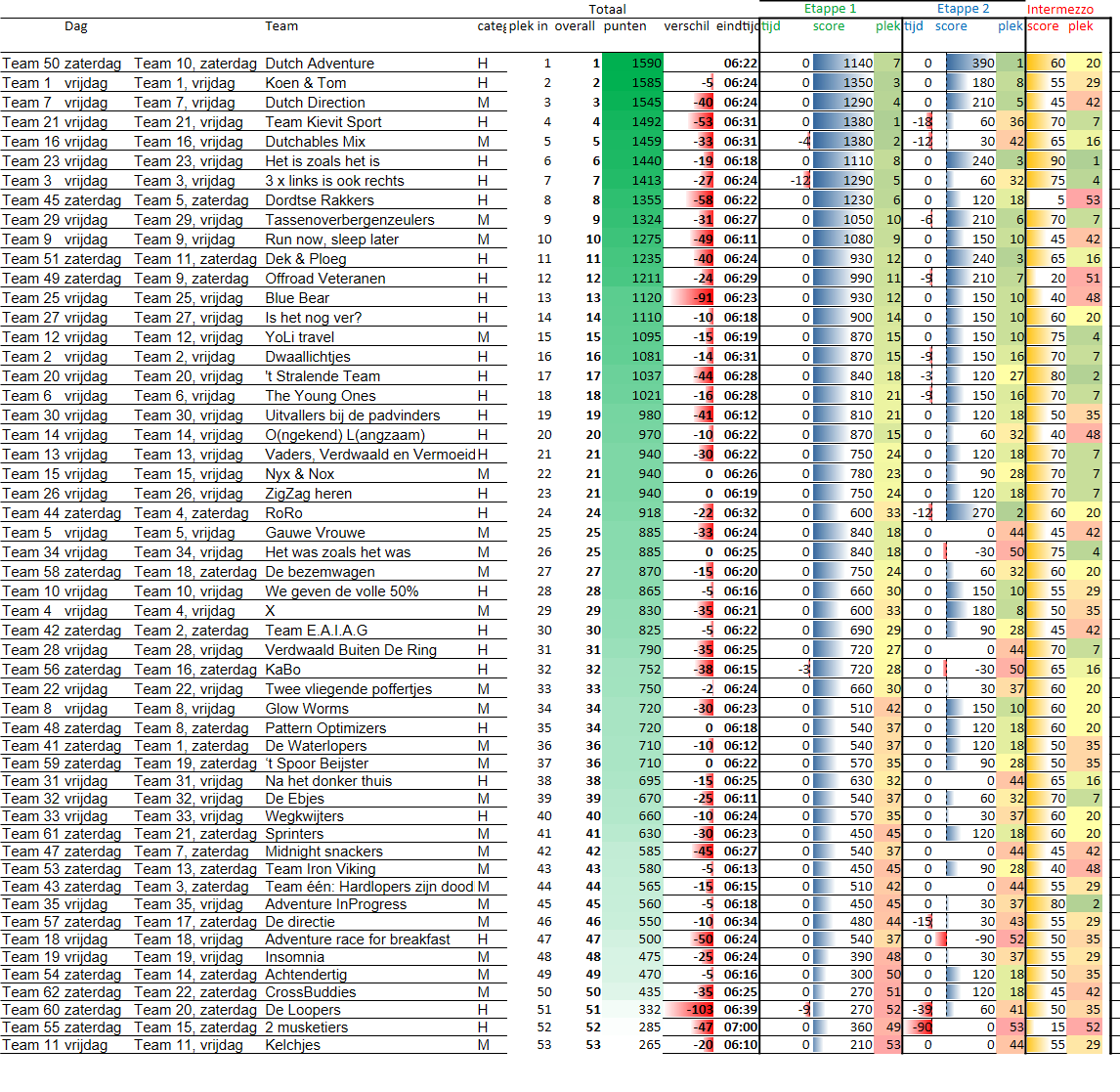 Het hoekje in het noordwesten was duidelijk te ver weg voor de meeste teams, daar kwam maar 17%. En het zelfde geldt voor de meest zuidwestelijke punten. Jammer dat CP27 met de glow sticks, ondanks de dubbele punten die je daar kon verdienen, werd overgeslagen. Het was zo’n fascinerend gezicht in het donker. Maar ook de kompaskoersen route, met 3 CP’s dicht achter elkaar, werd vermoedelijk te moeilijk geacht.