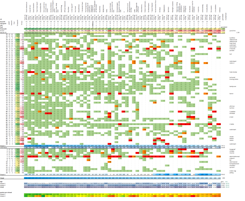 Helaas zijn een aantal -naar onze mening- leuke CP’s nauwelijks bezocht (maar gelukkig zijn overal wel ten minste 2 teams geweest). Zoals de kompaskoersen uit de simulator, de luchtfoto met glow-in-the-dark-sticks, de punten op de oude kaart, en de punten in etappe 2 waarvoor je de gegevens uit etappe 1 nodig had.