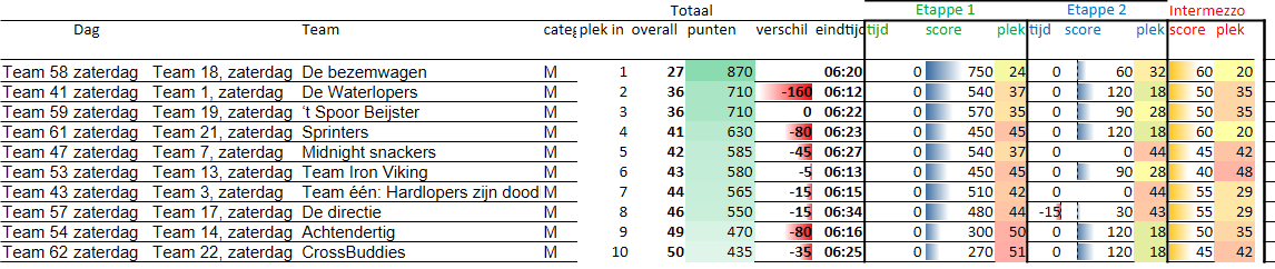 Strategisch was het best uitdagend: Zou je zorgen dat er voldoende tijd is om alle verzamelde gegevens van etappe 1 ten volste te benutten en alle specials in etappe 2 te scoren? Dan moet je wel zorgen dat er voldoende tijd voor is. Maar als het nou meevalt is er tijd over en had je beter wat meer punten in etappe 1 kunnen pakken. Als je naar de uitslag kijkt zie je dat het gemiddelde aantal punten gescoord per minuut in etappe 2 minder was dan in etappe 1. Behalve voor het winnende team en de nummer 4. Dat was niet onze opzet, we wilden het aantrekkelijk maken om de extra informatie bij etappe 1 te verzamelen en die in etappe 2 te verzilveren. Maar omdat maar weinig teams de speciale opdrachten uitvoerden lagen de CP’s die overbleven in etappe 2 relatief ver uit elkaar, en was dus het aantal punten per minuut laag. En daarmee is dit misleidende statistiek. Een drogredenering. Juist als je wel de extra CP’s had gedaan in etappe 2 met de informatie uit etappe 1, was etappe 2 erg lucratief geweest. Dat laat ook het winnende team zien. Dus voor de volgende keer: extra punten geven voor de CP’s waarvan we graag willen dat ze ook daadwerkelijk gedaan worden. En de deelnemers informeren: dat de extra punten die je tijdens de race vindt een kortere afstand tussen de CP’s opleveren.
