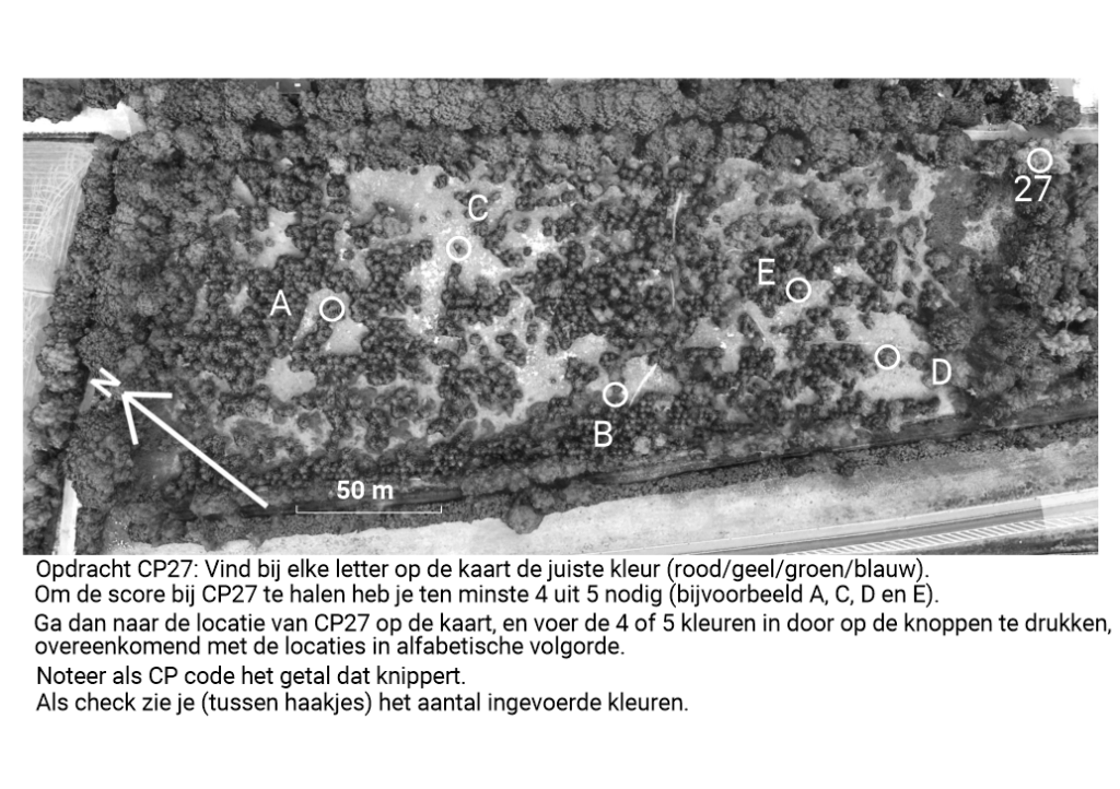 CP27 was een punt met veel werk maar helaas weinig bezoekers. Daar was vroeger een kerstbomenkwekerij, de helft van de sparren is gerooid, het restant vormt een doolhof van groen en open plekken, bovendien heel herkenbaar op de luchtfoto. Daar móést iets mee gedaan worden. Het idee was simpel: er staan 5 cirkels op de kaart, met letters A t/m E, in elke hangt een glow-stick (en een gekleurd kaartje als back-up) in rood, geel, groen of blauw. Op een 6e punt op de kaart hangt aan een boom een kastje met 4 gekleurde knoppen, en bij elke combinatie van kleuren in een bepaalde volgorde verschijnt een min of meer uniek getal. Dat is de CP code. De moeilijkheid zit hem in de misschien iets te overtallige valse glow-sticks. Het idee was dat die een spoor van de eerste tot de laatste vormen, maar ze leiden ook weer af en maken het lastiger om de juiste te vinden. 8% (dat zijn 4 teams) doen dit CP. Ze hebben dan wel weer alles goed. Overigens is elke combinatie van 4 van de 5 geldig, als de kleuren en de alfabetische volgorde maar goed zijn. Het ophangen van de glowsticks was nog wel een dingetje. Dat deed ik zaterdag ná de start, en toen ik klaar was kwam het eerste team al aanlopen. Net op tijd was ik.