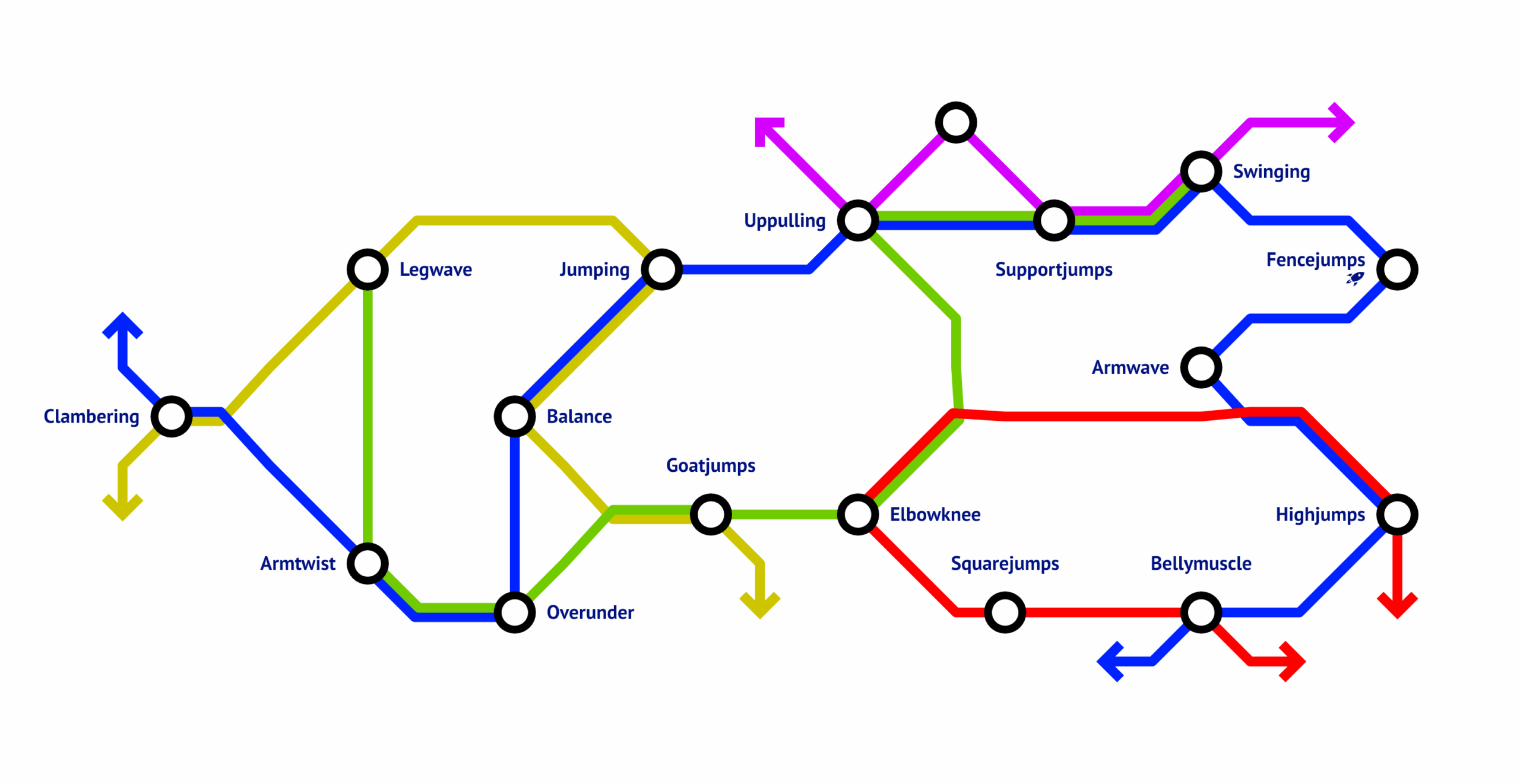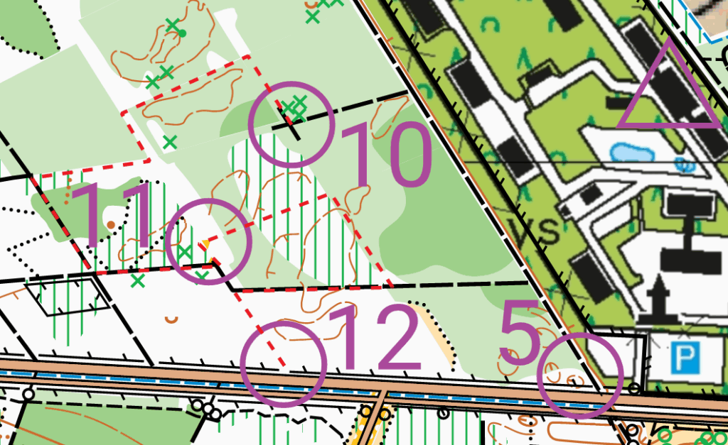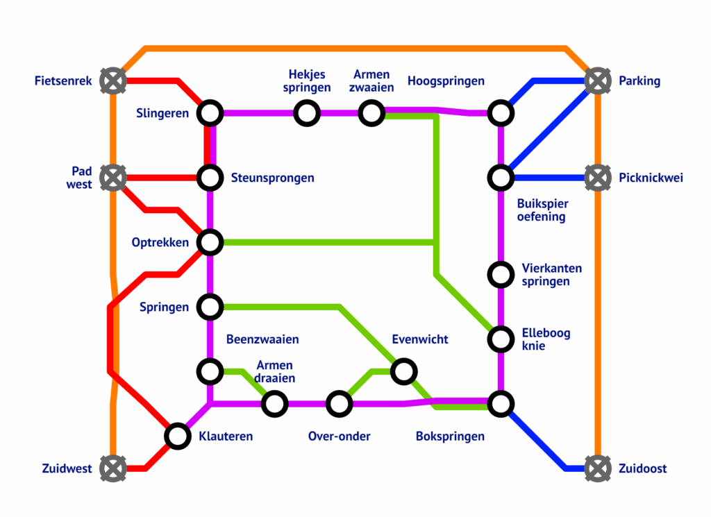 CP47 en CP48 waren een idee uit de N8-run van 2022, dat we niet meer hebben uitgevoerd toen. Een wirwar van paadjes, maar dan schematisch weergegeven als een metroplattegrond. En de verengelste stationsnamen zijn dan weer een beetje hierop geïnspireerd. Het is maar een pietepeuterig stukje bos, met een trimparcours. Paaltjes, rekstokken, evenwichtsbalk, etc. Hoe maak je daar wat leuks van? Door het moeilijk te maken.
