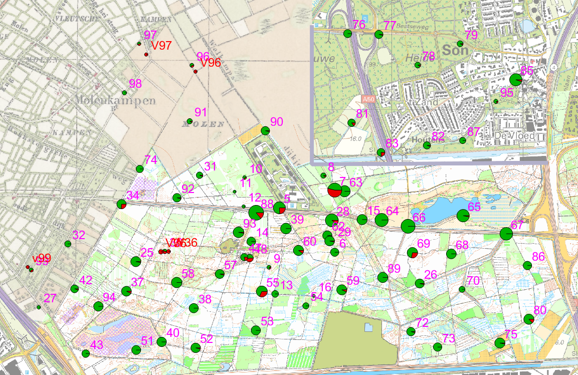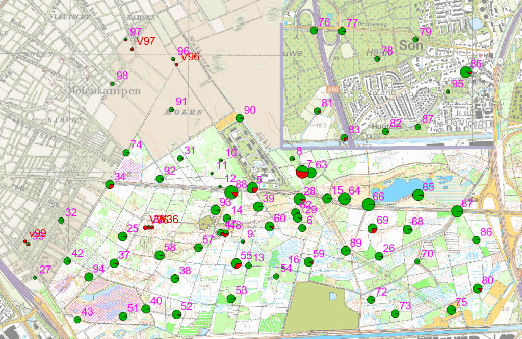 Hier onder zie je op de kaart aangegeven hoeveel teams elk punt bezochten, weergegeven als de diameter van de bolletjes. Ook zie je in rood/groen hoeveel teams het “foute” CP noteerden. Je kan hier niet helemaal de gelopen routes uit halen, maar duidelijk is wel dat de punten “dicht bij huis” het meest gevonden werden (niet verwonderlijk), en dat het rondje in het zuidoosten veelal CP70 oversloeg.