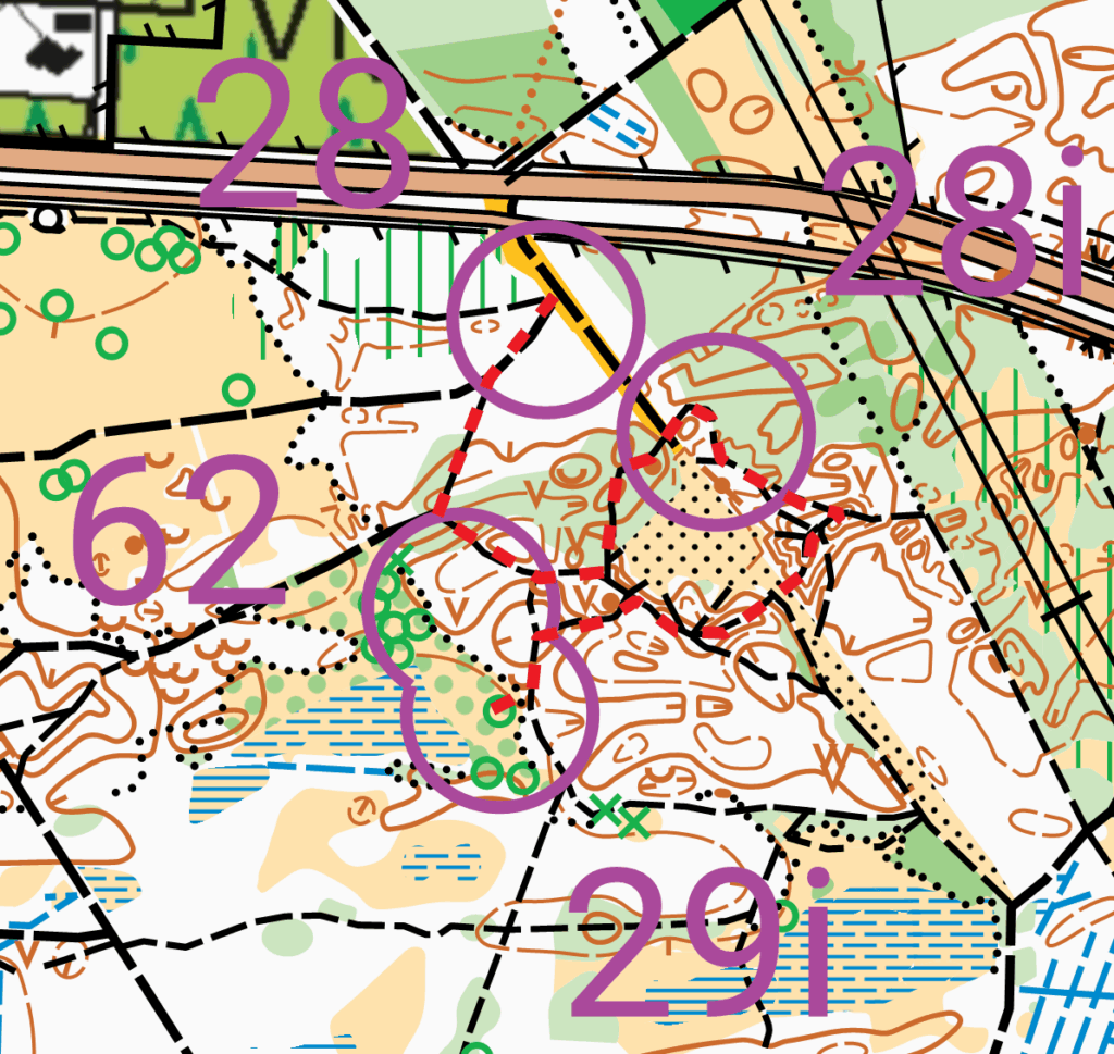 Wie van de drie: CP36 was moeilijker dan we verwacht hadden. Daar lagen 3 heuvels. Het CP hing op de middelste, maar op de oostelijker en westelijker heuvel hing ook een blauw kaartje. De drie heuvels stonden nog wel op de IOF kaart, dus je kon zien dat de juiste heuvel niet per se de eerste de beste bult was. De uitkomst is in die zin verrassend dat bijna tweederde het verkeerde nummer noteerde, klaarblijkelijk liep men op goed geluk naar 1 van de heuveltjes.