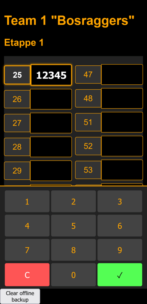 Elk team kreeg een blauw kaartje met z’n team nummer er op: ook handig voor de team-foto’s. Achterop een QR-code (en het antwoord van CP93) waarmee een unieke pagina opende als die gescand werd met ieders smartphone. Daarop stonden alle CP’s van de betreffende etappe, in de zelfde volgorde en lay-out als op het papieren antwoordenstrookje. Nummer intoetsen, groene knop (of volgend vakje) aantippen, en dóór. Onderaan een grote knop “inleveren”, waarna de antwoorden ook niet meer gewijzigd konden worden.