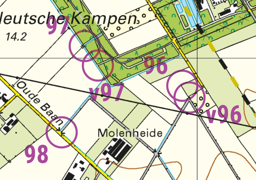 Bij CP96 was het iets lastiger. Op de oude kaart lijkt het halverwege een pad, zonder verdere referentie, maar in het echt is daar een hoek van een akkertje. Er staat ook een ‘biels’ in de grond, volgens het roadbook; als je er bent zie je die. Maar goed, rondom het akkertje staan op alle hoeken oude spoorbielzen. Soms komen we iets tegen waar we wel een CP van móéten maken. Het belangrijkste om niet het valse CP te noteren is dat je ziet dat het niet in het verlengde ligt van de weg naar het zuidwesten. 33% van de teams zag dat niet. Wat des te opvallender is, want op het CP zelf hing een moderne topo kaart waar dat nog duidelijker op te zien was.